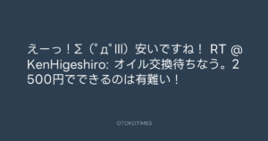 青山英樹 @aoyama_hideki – 14:32・2011年9月15日 2011 9/15 青山英樹 2011-09-15 えーっ!Σ(゚д゚lll)安いですね! RT @KenHigeshiro: オイル交換待ちなう。2500円でできるのは有難い! Source:https://x.com/aoyama_hideki/status/114209931099... text X Post 青山英樹 青山英樹 この記事が気に入ったら フォローしてね! Follow @OtokoTimes1988 よかったらシェアしてね! URLをコピーしました! 青山英樹 @aoyama_hideki - 13:34・2011年9月15日 寺岡呼人 @yohito_teraoka - 22:04・2011年9月15日 関連記事 Artist 青山英樹 1986.08.29