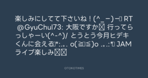青山英樹 @aoyama_hideki – 18:55・2011年10月2日 2011 10/02 青山英樹 2011-10-02 楽しみにしてて下さいね!(^_−)−☆ RT @GyuChul73: 大阪ですか‼ 行ってらっしゃーい(^-^)/ とうとう今月ヒデキくんに会える☆*:.。. o(≧▽≦)o .。.:*☆ JAMライブ楽しみ‼‼ Source:https://x.com/aoyama_hideki/status/120436833745... text X Post 青山英樹 青山英樹 この記事が気に入ったら フォローしてね! Follow @OtokoTimes1988 よかったらシェアしてね! URLをコピーしました! 青山英樹 @aoyama_hideki - 18:54・2011年10月2日 青山英樹 @aoyama_hideki - 18:58・2011年10月2日 関連記事 Artist 青山英樹 1986.08.29