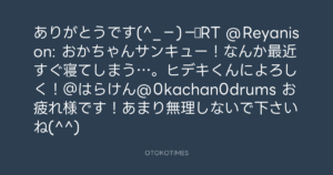 ありがとうです(^_−)−☆RT @Reyanison: おかちゃんサンキュー!なんか最近すぐ寝てしまう…。ヒデキくんによろしく!@はらけん@0kachan0drums お疲れ様です!あまり無理しないで下さいね(^^)