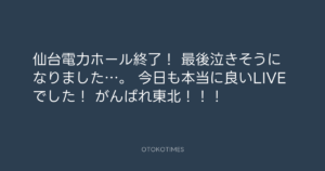 青山英樹 @aoyama_hideki – 20:58・2011年11月13日 2011 11/13 青山英樹 2011-11-13 仙台電力ホール終了! 最後泣きそうになりました…。 今日も本当に良いLIVEでした! がんばれ東北!!! Source:https://x.com/aoyama_hideki/status/135687929812... text X Post 青山英樹 青山英樹 この記事が気に入ったら フォローしてね! Follow @OtokoTimes1988 よかったらシェアしてね! URLをコピーしました! Koyo Maeda @koyomaeda - 17:12・2011年11月13日 Koyo Maeda @koyomaeda - 21:12・2011年11月13日 関連記事 Artist 青山英樹 1986.08.29