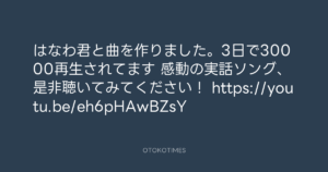🎬 寺岡 呼人 @yohitoteraoka – 15:16・2017年3月6日(IG post) 2017 3/06 寺岡呼人 2017-03-06 はなわ君と曲を作りました。3日で30000再生されてます😃 感動の実話ソング、 是非聴いてみてください! https://youtu.be/eh6pHAwBZsY Source:https://www.instagram.com/p/BRSUoxghq3r/ IG Post VIDEO 寺岡呼人 寺岡呼人 この記事が気に入ったら フォローしてね! Follow @OtokoTimes1988 よかったらシェアしてね! URLをコピーしました! 🎬 寺岡呼人 @yohito_teraoka - 15:05・2017年3月6日 🎬 寺岡 呼人 @yohitoteraoka - 15:16・2017年3月6日(IG post) 関連記事 Artist 寺岡呼人 1968.02.07
