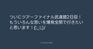 青山英樹 @aoyama_hideki – 10:56・2012年1月29日 2012 1/29 青山英樹 2012-01-29 ついにツアーファイナル武道館2日目!もういろんな思いを爆発全開で行きたいと思います!(◎_◎;)/ Source:https://x.com/aoyama_hideki/status/163440222506... text X Post 青山英樹 青山英樹 この記事が気に入ったら フォローしてね! Follow @OtokoTimes1988 よかったらシェアしてね! URLをコピーしました! 青山英樹 @aoyama_hideki - 10:45・2012年1月29日 青山英樹 @aoyama_hideki - 11:24・2012年1月29日 関連記事 Artist 青山英樹 1986.08.29