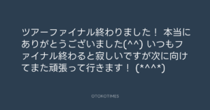 青山英樹 @aoyama_hideki – 20:22・2012年1月29日 2012 1/29 青山英樹 2012-01-29 ツアーファイナル終わりました! 本当にありがとうございました(^^) いつもファイナル終わると寂しいですが次に向けてまた頑張って行きます! (*^^*) Source:https://x.com/aoyama_hideki/status/163582813390... text X Post 青山英樹 青山英樹 この記事が気に入ったら フォローしてね! Follow @OtokoTimes1988 よかったらシェアしてね! URLをコピーしました! Koyo Maeda @koyomaeda - 14:02・2012年1月29日 青山英樹 @aoyama_hideki - 11:03・2012年1月30日 関連記事 Artist 青山英樹 1986.08.29