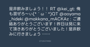 RT @kei_gt: 俺も混ぜろ~ぃ(*´ω`*)QT @aoyama_hideki @makkana_mACKAz : ご連絡ありがとうございます!昨日は見に来て頂きありがとうございました!是非飲みに行きましょう RT @makkana_mACKAz: