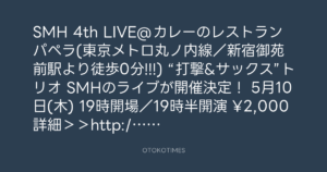 SMH 4th LIVE@カレーのレストラン パペラ(東京メトロ丸ノ内線/新宿御苑前駅より徒歩0分!!!) “打撃&サックス”トリオ SMHのライブが開催決定! 5月10日(木)