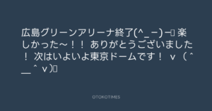 青山英樹 @aoyama_hideki – 20:42・2012年4月14日 2012 4/14 青山英樹 2012-04-14 広島グリーンアリーナ終了(^_−)−☆ 楽しかった~!! ありがとうございました! 次はいよいよ東京ドームです! v(^_^v)♪ Source:https://x.com/aoyama_hideki/status/191129214324... text X Post 青山英樹 青山英樹 この記事が気に入ったら フォローしてね! Follow @OtokoTimes1988 よかったらシェアしてね! URLをコピーしました! Koyo Maeda @koyomaeda - 14:03・2012年4月14日 寺岡呼人 @yohito_teraoka - 13:09・2012年4月15日 関連記事 Artist 青山英樹 1986.08.29