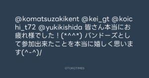 青山英樹 @aoyama_hideki – 23:38・2012年4月29日 2012 4/29 青山英樹 2012-04-29 @komatsuzakikent @kei_gt @koichi_t72 @yukikishida 皆さん本当にお疲れ様でした!(*^^*) バンドーズとして参加出来たことを本当に嬉しく思います(^-^)/ Source:https://x.com/aoyama_hideki/status/196609371847... text X Post 青山英樹 青山英樹 この記事が気に入ったら フォローしてね! Follow @OtokoTimes1988 よかったらシェアしてね! URLをコピーしました! 寺岡呼人 @yohito_teraoka - 21:33・2012年4月29日 青山英樹 @aoyama_hideki - 23:55・2012年4月29日 関連記事 Artist 青山英樹 1986.08.29