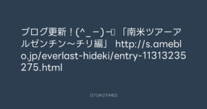 青山英樹 @aoyama_hideki – 16:42・2012年7月27日 2012 7/27 青山英樹 2012-07-27 ブログ更新!(^_−)−☆ 「南米ツアーアルゼンチン~チリ編」 http://s.ameblo.jp/everlast-hideki/entry-11313235275.html Source:https://x.com/aoyama_hideki/status/228757356979... text X Post 青山英樹 青山英樹 この記事が気に入ったら フォローしてね! Follow @OtokoTimes1988 よかったらシェアしてね! URLをコピーしました! 青山英樹 @aoyama_hideki - 16:41・2012年7月27日 青山英樹 @aoyama_hideki - 16:44・2012年7月27日 関連記事 Artist 青山英樹 1986.08.29