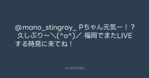 青山英樹 @aoyama_hideki – 0:37・2012年9月21日 2012 9/21 青山英樹 2012-09-21 @mano_stingray_ Pちゃん元気ー!? 久しぶり~\(^o^)/ 福岡でまたLIVEする時見に来てね! Source:https://x.com/aoyama_hideki/status/248808219131... text X Post 青山英樹 青山英樹 この記事が気に入ったら フォローしてね! Follow @OtokoTimes1988 よかったらシェアしてね! URLをコピーしました! 青山英樹 @aoyama_hideki - 23:08・2012年9月20日 寺岡呼人 @yohito_teraoka - 17:07・2012年9月21日 関連記事 Artist 青山英樹 1986.08.29