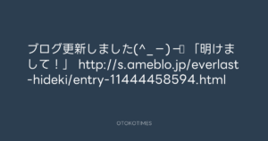 青山英樹 @aoyama_hideki – 1:06・2013年1月8日 2013 1/08 青山英樹 2013-01-08 ブログ更新しました(^_−)−☆ 「明けまして!」 http://s.ameblo.jp/everlast-hideki/entry-11444458594.html Source:https://x.com/aoyama_hideki/status/288315770713... text X Post 青山英樹 青山英樹 この記事が気に入ったら フォローしてね! Follow @OtokoTimes1988 よかったらシェアしてね! URLをコピーしました! Koyo Maeda @koyomaeda - 19:45・2013年1月7日 Koyo Maeda @koyomaeda - 14:17・2013年1月8日 関連記事 Artist 青山英樹 1986.08.29