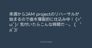青山英樹 @aoyama_hideki – 0:01・2013年1月26日 2013 1/26 青山英樹 2013-01-26 来週からJAM projectのリハーサルが始まるので曲を爆裂的に仕込み中! (=゚ω゚)ノ 気付いたらこんな時間だ…。 ( ゚д゚)/ Source:https://x.com/aoyama_hideki/status/294822409108... text X Post 青山英樹 青山英樹 この記事が気に入ったら フォローしてね! Follow @OtokoTimes1988 よかったらシェアしてね! URLをコピーしました! 青山英樹 @aoyama_hideki - 23:54・2013年1月24日 青山英樹 @aoyama_hideki - 23:21・2013年1月28日 関連記事 Artist 青山英樹 1986.08.29