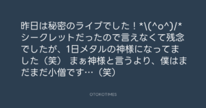 青山英樹 @aoyama_hideki – 23:10・2013年2月2日 2013 2/02 青山英樹 2013-02-02 昨日は秘密のライブでした!*\(^o^)/* シークレットだったので言えなくて残念でしたが、1日メタルの神様になってました(笑) まぁ神様と言うより、僕はまだまだ小僧です…(笑) Source:https://x.com/aoyama_hideki/status/297708633196... text X Post 青山英樹 青山英樹 この記事が気に入ったら フォローしてね! Follow @OtokoTimes1988 よかったらシェアしてね! URLをコピーしました! 青山英樹 @aoyama_hideki - 19:25・2013年1月30日 青山英樹 @aoyama_hideki - 23:14・2013年2月2日 関連記事 Artist 青山英樹 1986.08.29