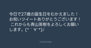 青山英樹 @aoyama_hideki – 13:13・2013年8月29日 2013 8/29 青山英樹 2013-08-29 今日で27歳の誕生日をむかえました! お祝いツイートありがとうございます! これからも青山英樹をよろしくお願いします。(*´∀`*)ノ Source:https://x.com/aoyama_hideki/status/372934966973... text X Post 青山英樹 青山英樹 この記事が気に入ったら フォローしてね! Follow @OtokoTimes1988 よかったらシェアしてね! URLをコピーしました! Koyo Maeda @koyomaeda - 9:55・2013年8月29日 寺岡 呼人 @yohitoteraoka - 19:33・2013年8月29日(IG post) 関連記事 Artist 青山英樹 1986.08.29