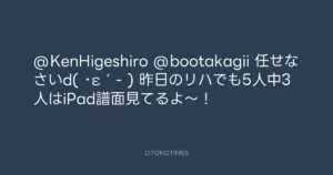 青山英樹 @aoyama_hideki – 13:05・2013年10月3日 2013 10/03 青山英樹 2013-10-03 @KenHigeshiro @bootakagii 任せなさいd( ・ε´- ) 昨日のリハでも5人中3人はiPad譜面見てるよ〜! Source:https://x.com/aoyama_hideki/status/385616456009... text X Post 青山英樹 青山英樹 この記事が気に入ったら フォローしてね! Follow @OtokoTimes1988 よかったらシェアしてね! URLをコピーしました! 青山英樹 @aoyama_hideki - 13:02・2013年10月3日 寺岡 呼人 @yohitoteraoka - 12:54・2013年10月4日(IG post) 関連記事 Artist 青山英樹 1986.08.29