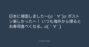 青山英樹 @aoyama_hideki – 16:41・2014年3月25日 2014 3/25 青山英樹 2014-03-25 日本に帰国しました〜(σ´∀`)σ ボストン楽しかった〜! いつも海外から帰るとお寿司食べくなる。σ(´∀` ) Source:https://x.com/aoyama_hideki/status/448363959309... text X Post 青山英樹 青山英樹 この記事が気に入ったら フォローしてね! Follow @OtokoTimes1988 よかったらシェアしてね! URLをコピーしました! 寺岡 呼人 @yohitoteraoka - 11:05・2014年3月25日(IG post) 青山英樹 @aoyama_hideki - 17:03・2014年3月25日 関連記事 Artist 青山英樹 1986.08.29