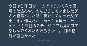 今日はOFF日で、1人でホテルで次の現場の仕込みや、のんびりしていましたがふと寝落ちした所に夢で亡くなった父が出て来て何故だか…めっちゃ笑ってた。σ(^_^;)