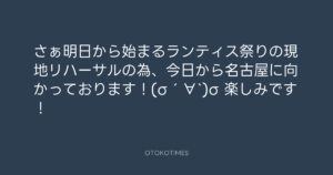 青山英樹 @aoyama_hideki – 9:48・2014年7月18日 2014 7/18 青山英樹 2014-07-18 さぁ明日から始まるランティス祭りの現地リハーサルの為、今日から名古屋に向かっております!(σ´∀`)σ 楽しみです! Source:https://x.com/aoyama_hideki/status/489934650526... text X Post 青山英樹 青山英樹 この記事が気に入ったら フォローしてね! Follow @OtokoTimes1988 よかったらシェアしてね! URLをコピーしました! 寺岡呼人 @yohito_teraoka - 9:30・2014年7月18日 青山英樹 @aoyama_hideki - 15:48・2014年7月18日 関連記事 Artist 青山英樹 1986.08.29