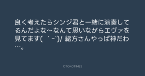 青山英樹 @aoyama_hideki – 21:25・2014年8月22日 2014 8/22 青山英樹 2014-08-22 良く考えたらシンジ君と一緒に演奏してるんだよな〜なんて思いながらエヴァを見てます( ´ー`)/ 緒方さんやっぱ神だわ…。 Source:https://x.com/aoyama_hideki/status/502793652792... text X Post 青山英樹 青山英樹 この記事が気に入ったら フォローしてね! Follow @OtokoTimes1988 よかったらシェアしてね! URLをコピーしました! 寺岡 呼人 @yohitoteraoka - 10:09・2014年8月22日(IG post) 青山英樹 @aoyama_hideki - 21:28・2014年8月22日 関連記事 Artist 青山英樹 1986.08.29
