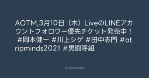 🎬 Addict of the Trip Minds @atripminds2021 – 01:38・2022年1月22日(IG post) 2022 1/22 ADDICT OF THE TRIP MINDS 2022-01-22 AOTM,3月10日(木)LiveのLINEアカウントフォロワー優先チケット発売中! #岡本健一 #川上シゲ #田中志門 #atripminds2021 #男闘呼組 Source:https://www.instagram.com/p/CY_8H5lh9xz/ ADDICT OF THE TRIP MINDS IG Post VIDEO 岡本健一 ADDICT OF THE TRIP MINDS この記事が気に入ったら フォローしてね! Follow @OtokoTimes1988 よかったらシェアしてね! URLをコピーしました! 🎬 Addict of the Trip Minds @atripminds2021 - 01:33・2022年1月22日(IG post) 🎬 Addict of the Trip Minds @atripminds2021 - 01:38・2022年1月22日(IG post) 関連記事 Artist ADDICT OF THE TRIP MINDS 1993.10.01 Artist 岡本健一 1969.05.21