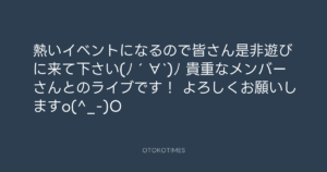 青山英樹 @aoyama_hideki – 15:04・2014年11月12日 2014 11/12 青山英樹 2014-11-12 熱いイベントになるので皆さん是非遊びに来て下さい(ノ´∀`)ノ 貴重なメンバーさんとのライブです! よろしくお願いしますo(^_-)O Source:https://x.com/aoyama_hideki/status/532413695641... text X Post 青山英樹 青山英樹 この記事が気に入ったら フォローしてね! Follow @OtokoTimes1988 よかったらシェアしてね! URLをコピーしました! 青山英樹 @aoyama_hideki - 15:00・2014年11月12日 青山英樹 @aoyama_hideki - 15:12・2014年11月12日 関連記事 Artist 青山英樹 1986.08.29