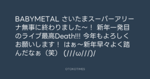 青山英樹 @aoyama_hideki – 21:51・2015年1月10日 2015 1/10 青山英樹 2015-01-10 BABYMETAL さいたまスーパーアリーナ無事に終わりました〜! 新年一発目のライブ最高Death!!! 今年もよろしくお願いします! はぁ〜新年早々よく踏んだなぁ(笑) (///ω///)/ Source:https://x.com/aoyama_hideki/status/553896832137... text X Post 青山英樹 青山英樹 この記事が気に入ったら フォローしてね! Follow @OtokoTimes1988 よかったらシェアしてね! URLをコピーしました! 寺岡 呼人 @yohitoteraoka - 12:00・2015年1月10日(IG post) 青山英樹 @aoyama_hideki - 9:56・2015年1月11日 関連記事 Artist 青山英樹 1986.08.29