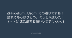 青山英樹 @aoyama_hideki – 18:44・2015年1月11日 2015 1/11 青山英樹 2015-01-11 @Hidefumi_Usami その通りですね! 離れても心はひとつ。ぐっと来ました! (>_<)/ また是非お願いします(。-人-。) Source:https://x.com/aoyama_hideki/status/554212124566... text X Post 青山英樹 青山英樹 この記事が気に入ったら フォローしてね! Follow @OtokoTimes1988 よかったらシェアしてね! URLをコピーしました! 青山英樹 @aoyama_hideki - 18:30・2015年1月11日 青山英樹 @aoyama_hideki - 12:04・2015年1月12日 関連記事 Artist 青山英樹 1986.08.29