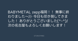 青山英樹 @aoyama_hideki – 21:48・2015年10月2日 2015 10/02 青山英樹 2015-10-02 BABYMETAL zepp福岡!! 無事に終わりました〜✨ 今日も叩き倒してきました! ありがとうございました(^-^)/ 次の名古屋もよろしくお願いします! Source:https://x.com/aoyama_hideki/status/649928922495... text X Post 青山英樹 青山英樹 この記事が気に入ったら フォローしてね! Follow @OtokoTimes1988 よかったらシェアしてね! URLをコピーしました! 青山英樹 @aoyama_hideki - 20:15・2015年10月1日 寺岡 呼人 @yohitoteraoka - 11:02・2015年10月3日(IG post) 関連記事 Artist 青山英樹 1986.08.29