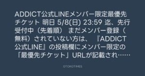 まだメンバー登録(無料)されていない方は、 『ADDICT公式LINE』の投稿欄にメンバー限定の「最優先チケット」URLが記載されています。そこからアクセスして予約して下さい。 まだメンバー登録(無料)されていない方は、 コチラから登録 → https://page.line.me/?accountId=324pziti 登録のあとに必ず、フォローして下さい。 フォローされていないと投稿欄を閲覧出来ません。