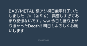 青山英樹 @aoyama_hideki – 20:45・2015年12月12日 2015 12/12 青山英樹 2015-12-12 BABYMETAL 横アリ初日無事終了いたしましたー✨(≧∇≦) 興奮しすぎてあまり記憶ないです。ww 今日も盛り上がり凄かったDeath!! 明日もよろしくお願いします! Source:https://x.com/aoyama_hideki/status/675642565060... text X Post 青山英樹 青山英樹 この記事が気に入ったら フォローしてね! Follow @OtokoTimes1988 よかったらシェアしてね! URLをコピーしました! 寺岡呼人 @yohito_teraoka - 13:07・2015年12月12日 🎬 寺岡 呼人 @yohitoteraoka - 11:42・2015年12月13日(IG post) 関連記事 Artist 青山英樹 1986.08.29