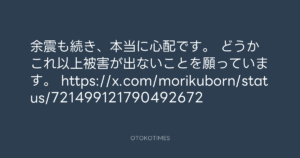 青山英樹 @aoyama_hideki – 12:05・2016年4月17日 2016 4/17 青山英樹 2016-04-17 余震も続き、本当に心配です。 どうかこれ以上被害が出ないことを願っています。 https://x.com/morikuborn/status/721499121790492672 Source:https://x.com/aoyama_hideki/status/721535089801... text X Post 青山英樹 青山英樹 この記事が気に入ったら フォローしてね! Follow @OtokoTimes1988 よかったらシェアしてね! URLをコピーしました! 寺岡 呼人 @yohitoteraoka - 22:24・2016年4月13日(IG post) 青山英樹 @aoyama_hideki - 20:50・2016年4月17日 関連記事 Artist 青山英樹 1986.08.29