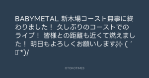 青山英樹 @aoyama_hideki – 23:23・2016年4月20日 2016 4/20 青山英樹 2016-04-20 BABYMETAL 新木場コースト無事に終わりました! 久しぶりのコーストでのライブ! 皆様との距離も近くて燃えました! 明日もよろしくお願いします✨ (´▽`*)/ Source:https://x.com/aoyama_hideki/status/722792813918... text X Post 青山英樹 青山英樹 この記事が気に入ったら フォローしてね! Follow @OtokoTimes1988 よかったらシェアしてね! URLをコピーしました! 寺岡 呼人 @yohitoteraoka - 23:48・2016年4月19日(IG post) 寺岡 呼人 @yohitoteraoka - 23:39・2016年4月20日(IG post) 関連記事 Artist 青山英樹 1986.08.29