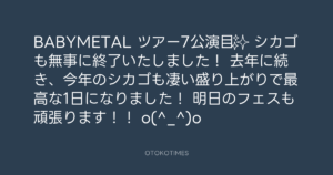 青山英樹 @aoyama_hideki – 12:24・2016年5月14日 2016 5/14 青山英樹 2016-05-14 BABYMETAL ツアー7公演目✨ シカゴも無事に終了いたしました! 去年に続き、今年のシカゴも凄い盛り上がりで最高な1日になりました! 明日のフェスも頑張ります!! o(^_^)o Source:https://x.com/aoyama_hideki/status/731324158198... text X Post 青山英樹 青山英樹 この記事が気に入ったら フォローしてね! Follow @OtokoTimes1988 よかったらシェアしてね! URLをコピーしました! 青山英樹 @aoyama_hideki - 1:05・2016年5月13日 青山英樹 @aoyama_hideki - 9:34・2016年5月15日 関連記事 Artist 青山英樹 1986.08.29
