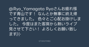 青山英樹 @aoyama_hideki – 15:07・2016年7月5日 2016 7/05 青山英樹 2016-07-05 @Ryo_Yamagata Ryoさんお疲れ様です青山です! なんとか無事に終え帰ってきました。 色々とご心配お掛けしました。 今度はまた客席から熱いライブ見させて下さい! よろしくお願い致します✨ Source:https://x.com/aoyama_hideki/status/750209452406... text X Post 青山英樹 青山英樹 この記事が気に入ったら フォローしてね! Follow @OtokoTimes1988 よかったらシェアしてね! URLをコピーしました! 青山英樹 @aoyama_hideki - 14:53・2016年7月5日 青山英樹 @aoyama_hideki - 15:15・2016年7月5日 関連記事 Artist 青山英樹 1986.08.29