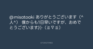 青山英樹 @aoyama_hideki – 2:43・2016年9月1日 2016 9/01 青山英樹 2016-09-01 @misatoaki ありがとうございます(^人^) 僕からも1日早いですが、おめでとうございます✨(≧∇≦) Source:https://x.com/aoyama_hideki/status/771040652729... text X Post 青山英樹 青山英樹 この記事が気に入ったら フォローしてね! Follow @OtokoTimes1988 よかったらシェアしてね! URLをコピーしました! 青山英樹 @aoyama_hideki - 2:41・2016年9月1日 青山英樹 @aoyama_hideki - 2:46・2016年9月1日 関連記事 Artist 青山英樹 1986.08.29