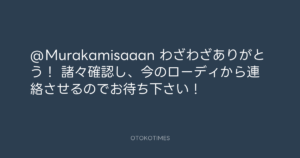 青山英樹 @aoyama_hideki – 9:53・2016年12月1日 2016 12/01 青山英樹 2016-12-01 @Murakamisaaan わざわざありがとう! 諸々確認し、今のローディから連絡させるのでお待ち下さい! Source:https://x.com/aoyama_hideki/status/804126166051... text X Post 青山英樹 青山英樹 この記事が気に入ったら フォローしてね! Follow @OtokoTimes1988 よかったらシェアしてね! URLをコピーしました! Koyo Maeda @koyomaeda - 9:35・2016年12月1日 青山英樹 @aoyama_hideki - 11:48・2016年12月1日 関連記事 Artist 青山英樹 1986.08.29