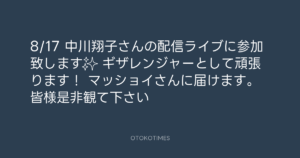 青山英樹 @aoyama_hideki – 0:05・2020年8月13日 2020 8/13 青山英樹 2020-08-13 8/17 中川翔子さんの配信ライブに参加致します✨ ギザレンジャーとして頑張ります! マッショイさんに届けます。 皆様是非観て下さい👍 Source:https://x.com/aoyama_hideki/status/129356415292... text X Post 青山英樹 青山英樹 この記事が気に入ったら フォローしてね! Follow @OtokoTimes1988 よかったらシェアしてね! URLをコピーしました! Koyo Maeda @koyomaeda - 12:30・2020年8月12日 青山英樹 @aoyama_hideki - 20:15・2020年8月13日 関連記事 Artist 青山英樹 1986.08.29