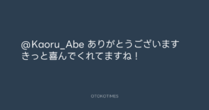 青山英樹 @aoyama_hideki – 23:37・2021年2月26日 2021 2/26 青山英樹 2021-02-26 @Kaoru_Abe ありがとうございます😊 きっと喜んでくれてますね! Source:https://x.com/aoyama_hideki/status/136531009243... text X Post 青山英樹 青山英樹 この記事が気に入ったら フォローしてね! Follow @OtokoTimes1988 よかったらシェアしてね! URLをコピーしました! Koyo Maeda @koyomaeda - 14:15・2021年2月26日 青山英樹 @aoyama_hideki - 23:38・2021年2月26日 関連記事 Artist 青山英樹 1986.08.29