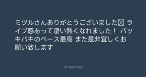 青山英樹 @aoyama_hideki – 17:56・2022年3月26日 2022 3/26 青山英樹 2022-03-26 ミツルさんありがとうございました‼️ ライブ感あって凄い熱くなれました! バッキバキのベース最高🤘 また是非宜しくお願い致します🤲 Source:https://x.com/aoyama_hideki/status/150764260026... text X Post 青山英樹 青山英樹 この記事が気に入ったら フォローしてね! Follow @OtokoTimes1988 よかったらシェアしてね! URLをコピーしました! 青山英樹 @aoyama_hideki - 17:47・2022年3月26日 岡本健一 @kenichi.okamoto - 00:32・2022年3月27日(IG post) 関連記事 Artist 青山英樹 1986.08.29