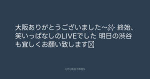 青山英樹 @aoyama_hideki – 21:45・2022年9月9日 2022 9/09 青山英樹 2022-09-09 大阪ありがとうございました〜✨ 終始、笑いっぱなしのLIVEでした👍 明日の渋谷も宜しくお願い致します‼️ Source:https://x.com/aoyama_hideki/status/156821908559... text X Post 青山英樹 青山英樹 この記事が気に入ったら フォローしてね! Follow @OtokoTimes1988 よかったらシェアしてね! URLをコピーしました! 寺岡呼人 @yohito_teraoka - 16:36・2022年9月9日 寺岡 呼人 @yohitoteraoka - 11:51・2022年9月10日(IG post) 関連記事 Artist 青山英樹 1986.08.29