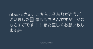 青山英樹 @aoyama_hideki – 16:56・2022年11月20日 2022 11/20 青山英樹 2022-11-20 atsukoさん、こちらこそありがとうございました‼️ 歌ももちろんですが、MCもさすがです!! また宜しくお願い致します✨ Source:https://x.com/aoyama_hideki/status/159423824597... text X Post 青山英樹 青山英樹 この記事が気に入ったら フォローしてね! Follow @OtokoTimes1988 よかったらシェアしてね! URLをコピーしました! 男闘呼組 @otokogumi.tokyo - 16:46・2022年11月20日(IG post) 男闘呼組 @otokogumi.tokyo - 17:06・2022年11月20日(IG post) 関連記事 Artist 青山英樹 1986.08.29