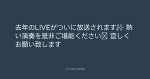 青山英樹 @aoyama_hideki – 17:08・2023年3月15日 2023 3/15 青山英樹 2023-03-15 去年のLIVEがついに放送されます✨ 熱い演奏を是非ご堪能ください‼️ 宜しくお願い致します🤲 Source:https://x.com/aoyama_hideki/status/163591584259... text X Post 青山英樹 青山英樹 この記事が気に入ったら フォローしてね! Follow @OtokoTimes1988 よかったらシェアしてね! URLをコピーしました! 男闘呼組 @otokogumi.tokyo - 17:04・2023年3月15日(IG Stories) 阿部充泰 @abemitsuyasu - 20:53・2023年3月15日 関連記事 Artist 青山英樹 1986.08.29