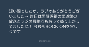 青山英樹 @aoyama_hideki – 9:41・2023年10月1日 2023 10/01 青山英樹 2023-10-01 短い間でしたが、ラジオありがとうございました〜🥲 昨日は男闘呼組の武道館の放送とラジオ最終回もあって盛り上がってましたね! 今後もROCK ONを宜しくです🤘 Source:https://x.com/aoyama_hideki/status/170828098917... text X Post 青山英樹 青山英樹 この記事が気に入ったら フォローしてね! Follow @OtokoTimes1988 よかったらシェアしてね! URLをコピーしました! 🎬 2023.10.01 - KAI☆CHOO @ STAFF BLOG(AddicTripS) 青山英樹 @aoyama_hideki - 9:41・2023年10月1日 関連記事 Artist 青山英樹 1986.08.29