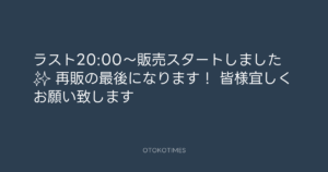 青山英樹 @aoyama_hideki – 20:03・2024年2月3日 2024 2/03 青山英樹 2024-02-03 ラスト20:00〜販売スタートしました✨ 再販の最後になります! 皆様宜しくお願い致します🤲 Source:https://x.com/aoyama_hideki/status/175373583815... text X Post 青山英樹 青山英樹 この記事が気に入ったら フォローしてね! Follow @OtokoTimes1988 よかったらシェアしてね! URLをコピーしました! Rockon Social Club @rockonsocialclub - 11:28・2024年2月3日(IG Stories) 青山英樹 @aoyama_hideki - 20:03・2024年2月3日 関連記事 Artist 青山英樹 1986.08.29