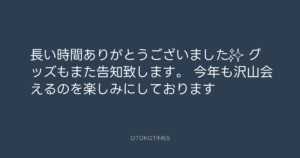 青山英樹 @aoyama_hideki – 22:38・2024年1月20日 2024 1/20 青山英樹 2024-01-20 長い時間ありがとうございました✨ グッズもまた告知致します。 今年も沢山会えるのを楽しみにしております🥁 Source:https://x.com/aoyama_hideki/status/174870150595... text X Post 青山英樹 青山英樹 この記事が気に入ったら フォローしてね! Follow @OtokoTimes1988 よかったらシェアしてね! URLをコピーしました! 青山英樹 @aoyama_hideki - 22:38・2024年1月20日 寺岡呼人 @yohito_teraoka - 0:27・2024年1月21日 関連記事 Artist 青山英樹 1986.08.29