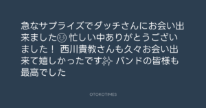 青山英樹 @aoyama_hideki – 19:10・2024年3月31日 2024 3/31 青山英樹 2024-03-31 急なサプライズでダッチさんにお会い出来ました☺️ 忙しい中ありがとうございました! 西川貴教さんも久々お会い出来て嬉しかったです✨ バンドの皆様も最高でした👍 Source:https://x.com/aoyama_hideki/status/177437876016... text X Post 青山英樹 青山英樹 この記事が気に入ったら フォローしてね! Follow @OtokoTimes1988 よかったらシェアしてね! URLをコピーしました! 青山英樹 @aoyama_hideki - 18:28・2024年3月31日 青山英樹 @aoyama_hideki - 19:10・2024年3月31日 関連記事 Artist 青山英樹 1986.08.29