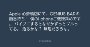 Koyo Maeda @koyomaeda – 11:14・2011年4月7日 2011 4/07 前田耕陽 2011-04-07 Apple 心斎橋店にて、GENIUS BARの順番待ち! 僕のi phoneご機嫌斜めです。 バイブにするとなぜかずっとブルってる。 治るかな? 無理だろうな。 Source:https://x.com/koyomaeda/status/55815753282236416 text X Post 前田耕陽 前田耕陽 この記事が気に入ったら フォローしてね! Follow @OtokoTimes1988 よかったらシェアしてね! URLをコピーしました! 寺岡呼人 @yohito_teraoka - 1:28・2011年4月7日 Koyo Maeda @koyomaeda - 11:14・2011年4月7日 関連記事 Artist 前田耕陽 1968.08.16