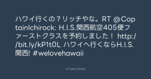ハワイ行くの?リッチやな。RT @CaptainIchirock: H.I.S.関西航空405便ファーストクラスを予約しました!