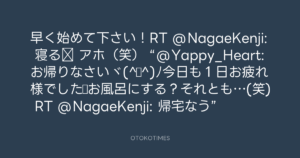 早く始めて下さい!RT @NagaeKenji: 寝る⁇ アホ(笑) “@Yappy_Heart: お帰りなさいヾ(^▽^)ノ今日も1日お疲れ様でした♪お風呂にする?それとも…(笑) RT @NagaeKenji: 帰宅なう”
