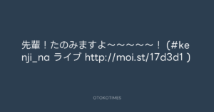 Koyo Maeda @koyomaeda – 23:07・2011年5月11日 2011 5/11 前田耕陽 2011-05-11 先輩!たのみますよ〜〜〜〜〜! (#kenji_na ライブ http://moi.st/17d3d1 ) Source:https://x.com/koyomaeda/status/68316237591093248 text X Post 前田耕陽 前田耕陽 この記事が気に入ったら フォローしてね! Follow @OtokoTimes1988 よかったらシェアしてね! URLをコピーしました! Koyo Maeda @koyomaeda - 23:06・2011年5月11日 Koyo Maeda @koyomaeda - 23:08・2011年5月11日 関連記事 Artist 前田耕陽 1968.08.16