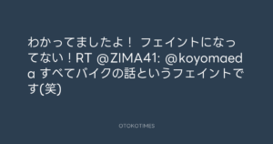 Koyo Maeda @koyomaeda – 19:25・2011年5月14日 2011 5/14 前田耕陽 2011-05-14 わかってましたよ! フェイントになってない!RT @ZIMA41: @koyomaeda すべてバイクの話というフェイントです(笑) Source:https://x.com/koyomaeda/status/69347506273783808 text X Post 前田耕陽 前田耕陽 この記事が気に入ったら フォローしてね! Follow @OtokoTimes1988 よかったらシェアしてね! URLをコピーしました! Koyo Maeda @koyomaeda - 19:22・2011年5月14日 青山英樹 @aoyama_hideki - 23:20・2011年5月14日 関連記事 Artist 前田耕陽 1968.08.16
